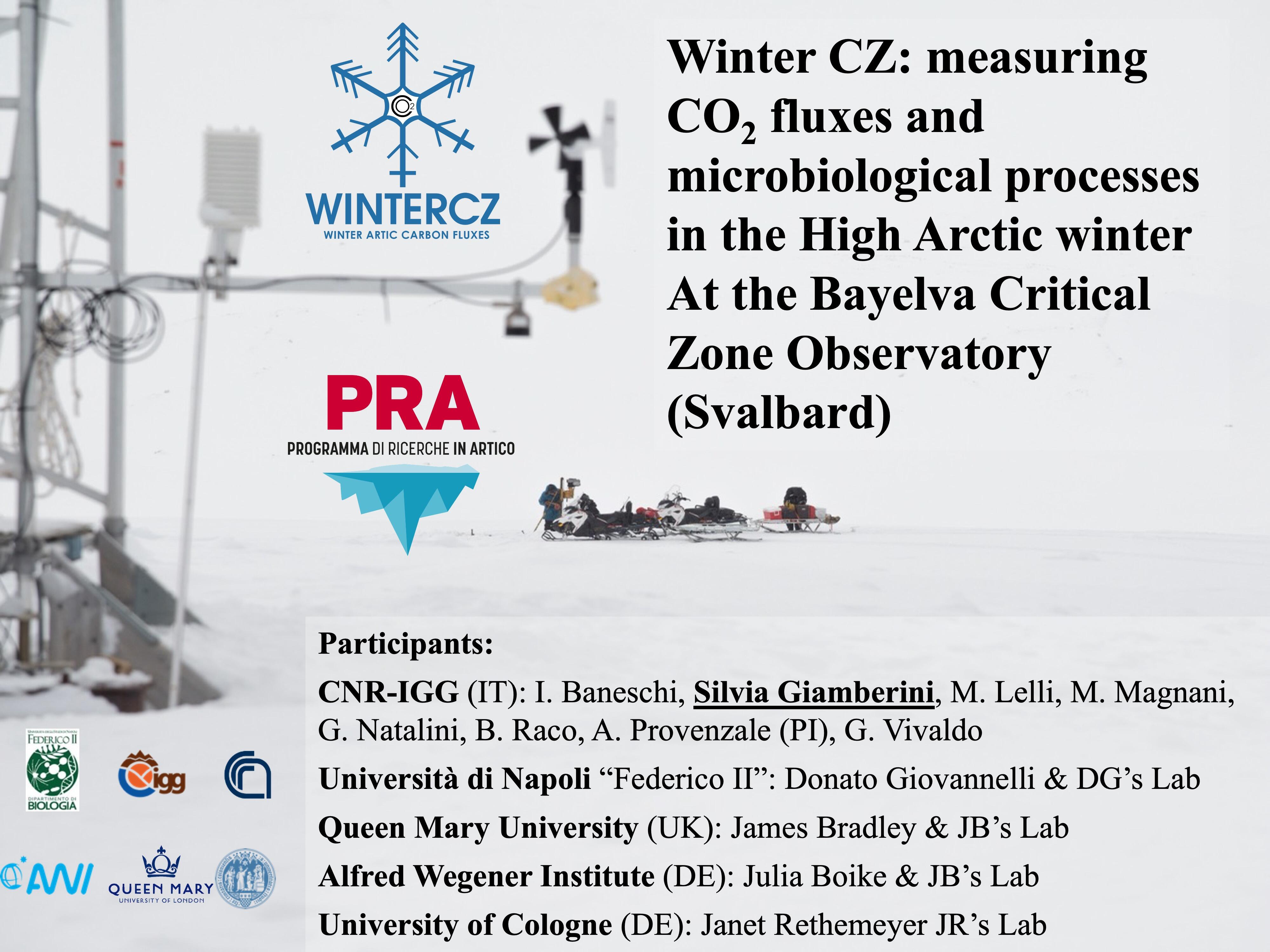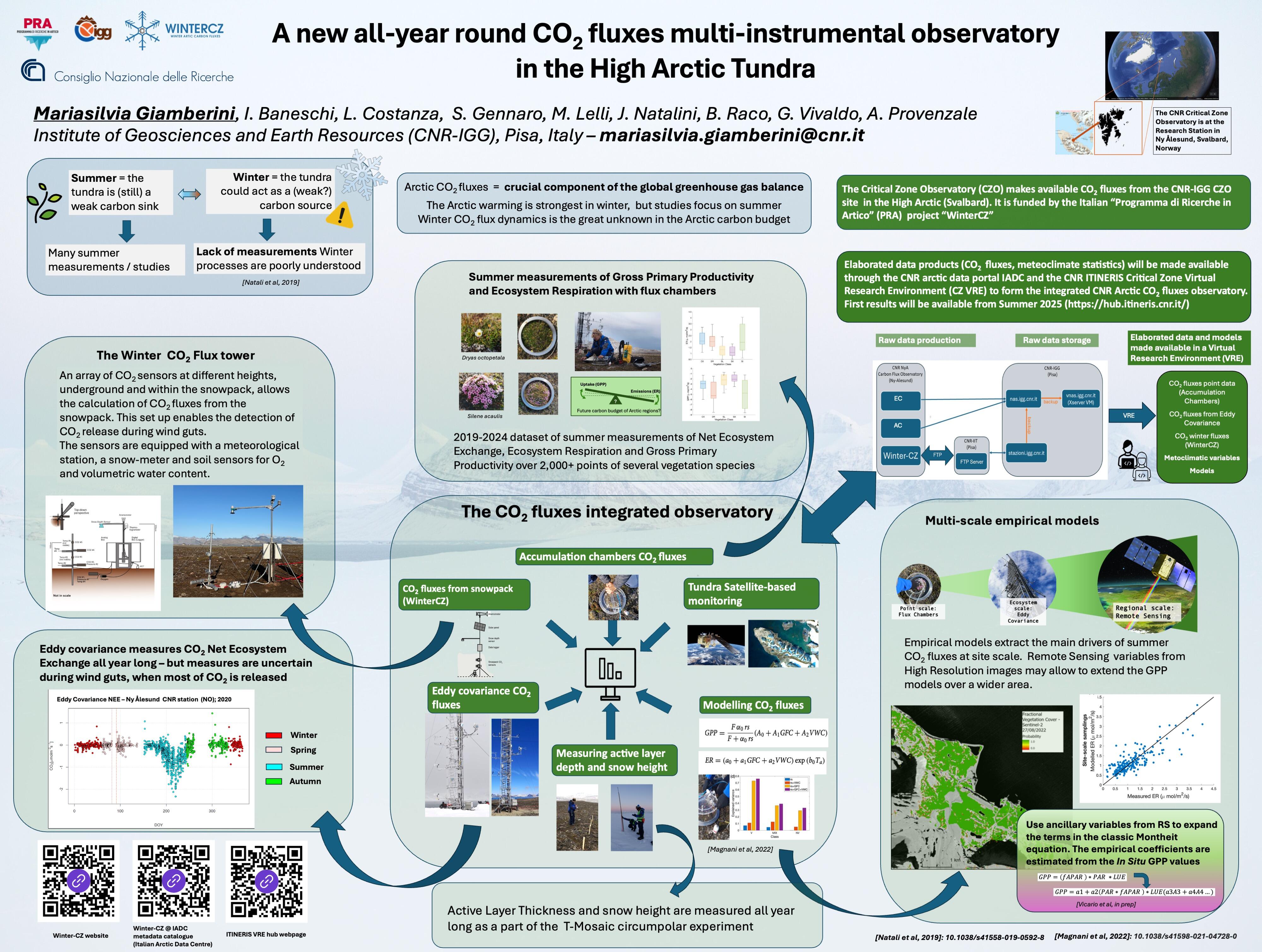 Arctic CO2 fluxes are a crucial component of the global greenhouse gas balance and are linked with the state and annual dynamics of the tundra. The assessment of the flux magnitude and timing is crucial for quantifying the contribution to climate change generated by the positive feedback induced by Arctic soil respiration. Summer gas flux data are now available for several locations in the Arctic, including those performed by IGG-CNR at the Bayelva Critical Zone Observatory in Ny Ålesund (CO2 summer fluxes by flux chambers and year-round fluxes by Eddy Covariance) used to implement empirical models of CO2 fluxes.  Existing data suggest, in fact, that during Winter the tundra could act as a weak carbon source. Winter processes, however, are poorly understood because of a lack of measurements spanning the ‘dark-season’.