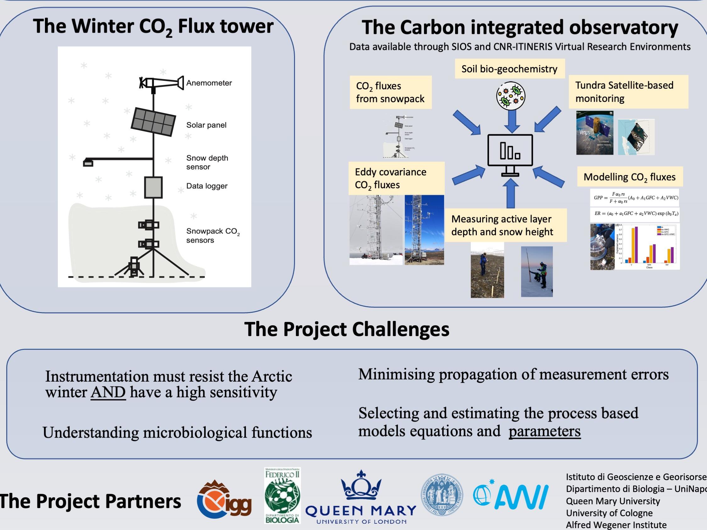 The project is aimed to build an Observatory of CO2 fluxes,  to fill the knowledge gap on the properties and drivers of COfluxes in the High Arctic. To complement the existing instrumentation, we installed a fixed station for measuring CO2 fluxes from snowpack and frozen soil; soil, snow and meteorological variables; and soil microbial composition and activity,  for monitoring  soil, snow, CO2 fluxes and microbiological activity in the Bayelva basin, during the snow-covered season, also developing data services and process-based models.